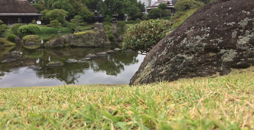 さて、まず行ったのが成趣園ですが、ここを簡単に説明すると清水が湧くこの地をいたく気に入った忠利が御茶屋として作事させ、綱利さんの代で大規模な作庭がなされた場所です。それだけあって青々とした小山の間をせせらぐ池、そこにかかるアーチ状の橋からの風景は、街の中とは思えないほど落ち着いた雰囲気で情緒あふれるきれいな庭園でした。